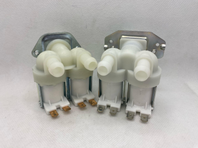 Оригинал. Электромагнитный впускной (заливной, наливной) клапан подачи воды для стиральных машин Samsung DC62-00024F. Двойной выход под 180° относительно входа. Диаметр соска 10,5 мм.