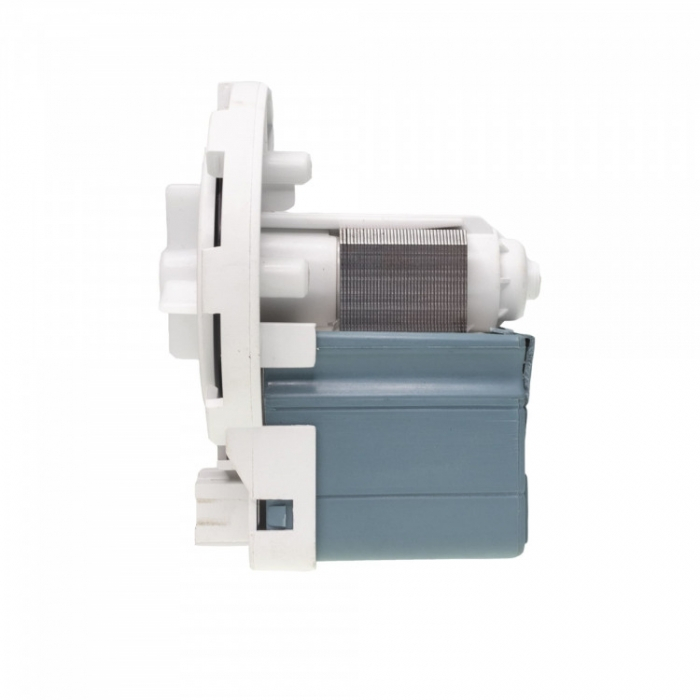 Сливной насос (помпа) мощностью 34 Ватт крепится к улитке на 8 защёлках. К стиральной машине подключается 2-мя контактами, которые находятся на передней стороне насоса. Данная помпа является УНИВЕРСАЛЬНОЙ и устанавливается в большое количество моделей стиральных машин.